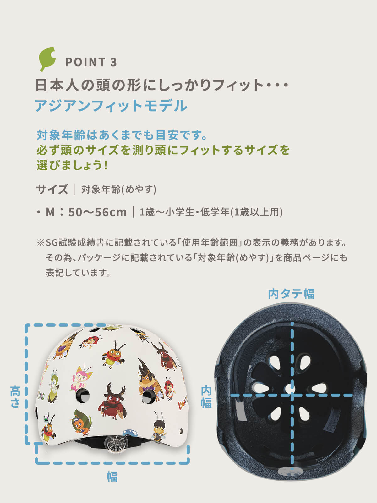対象年齢はあくまでも目安です。必ず頭のサイズを測り頭にフィットするサイズを選びましょう。