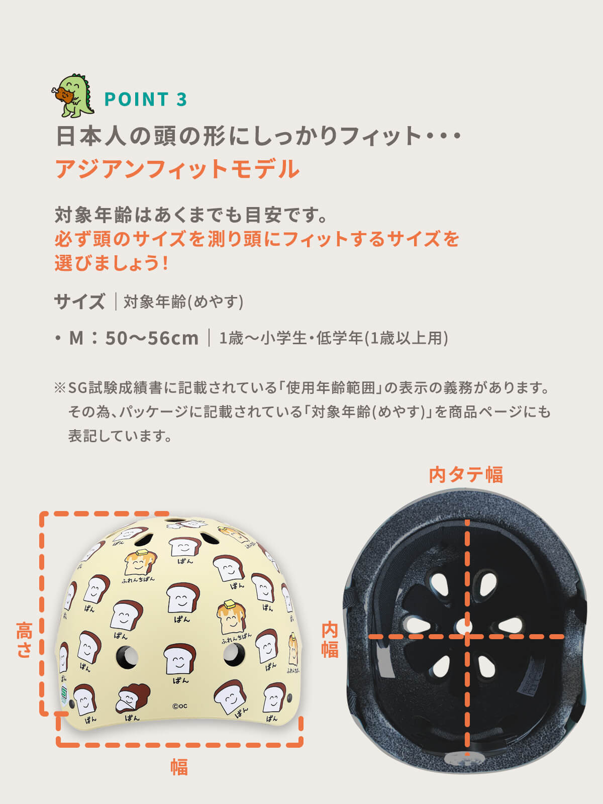 対象年齢はあくまでも目安です。必ず頭のサイズを測り頭にフィットするサイズを選びましょう。